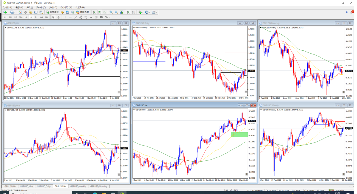今後の展開ですが、週足は下降トレンドで20MAにきれいに押えられ下がってきている場面、日足も戻り高値を少し抜いたものの100MAに押さえられ下がってきている事から、4時間足が長期足の流れに合わせるのか?